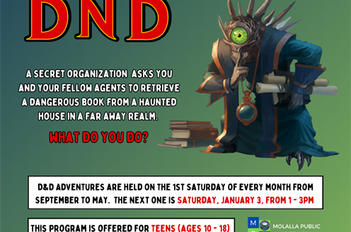Our Teen Dungeons & Dragons program runs from 1:00 to 3:00pm on the 1st Saturday of every month from September through May! No experience necessary! Just come and have a good time!